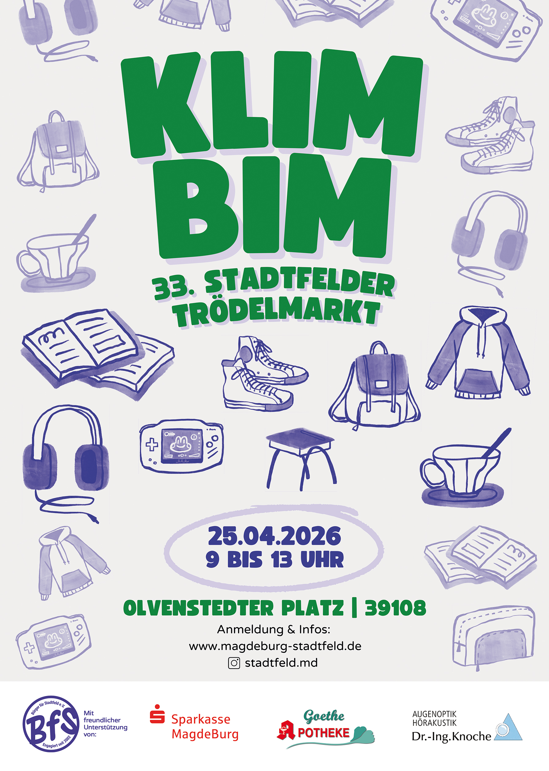 Die ersten Anmeldungen sind schon eingetrudelt. Aber keine Sorge, es sind noch ausreichend Stellplätze verfügbar. Anmelden könnt ihr euch wie immer per E-Mail an klimbim@magdeburg-stadtfeld.de. 80 Anmeldungen nehmen wir an, danach könnt ihr noch auf die Warteliste kommen.